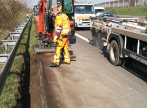 Bei einem Unfall ist Dieselkraftstoff ausgelaufen und hat den Seitenstreifen und die angrenzende Bankette kontaminiert. Die Untere Wasserbehörde hat den Austausch der kontaminierten Erde angewiesen.