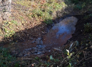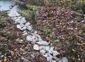 Im Zulauf zu einem Feuchtbiotop wurde ein Schlammfang ausgehoben und der Zulauf durch Wasserbausteine gesichert. Die Arbeiten wurden durch die Untere Wasserbehörde als zuständige Aufsichtsbehörde begleitet.
