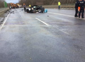 Die Unfallstelle war ein großes Trümmerfeld. Die ausgelaufenen Betriebsstoffe haben sich auf der … mehr